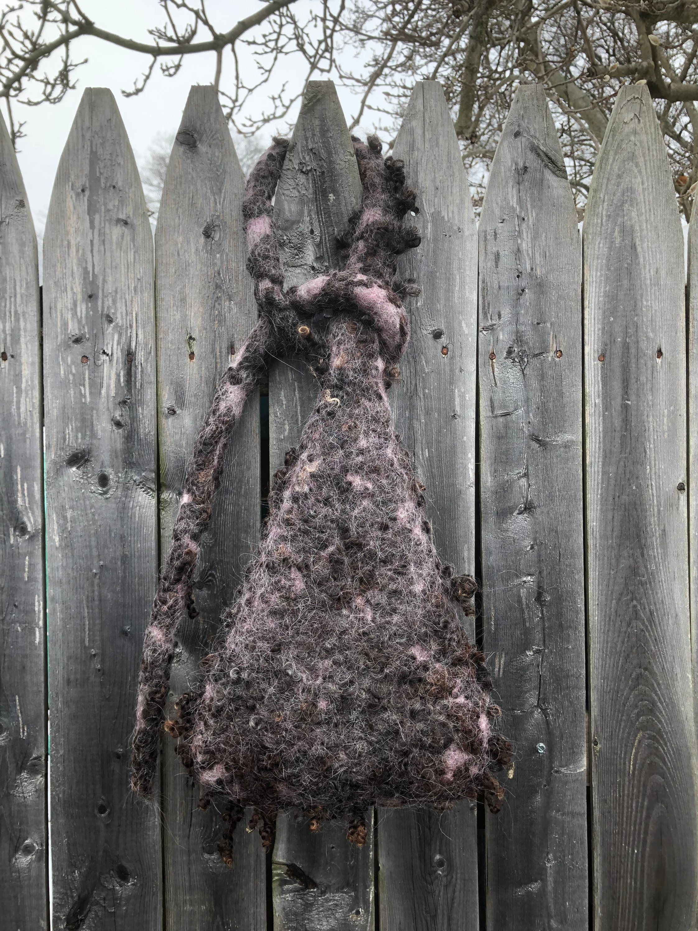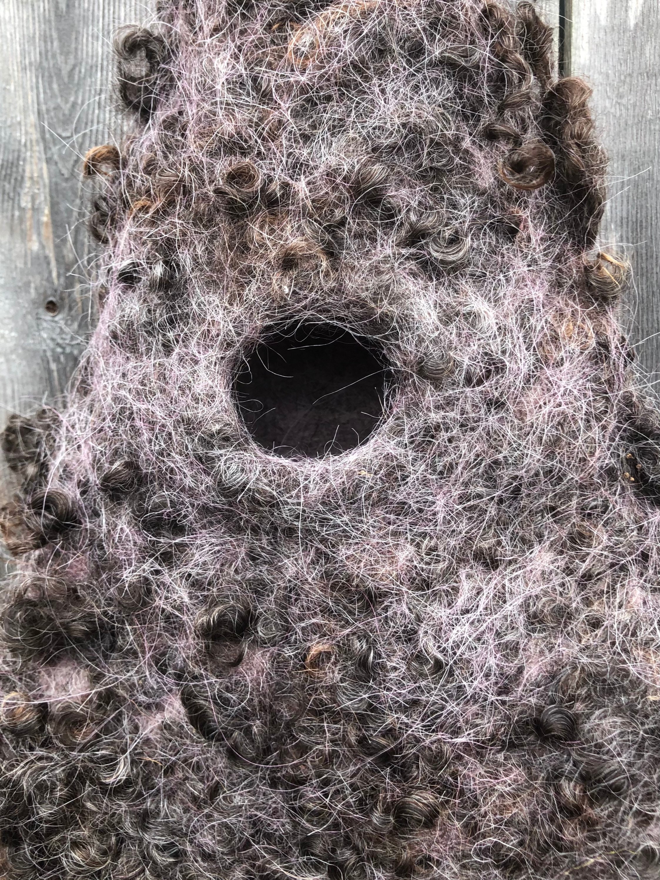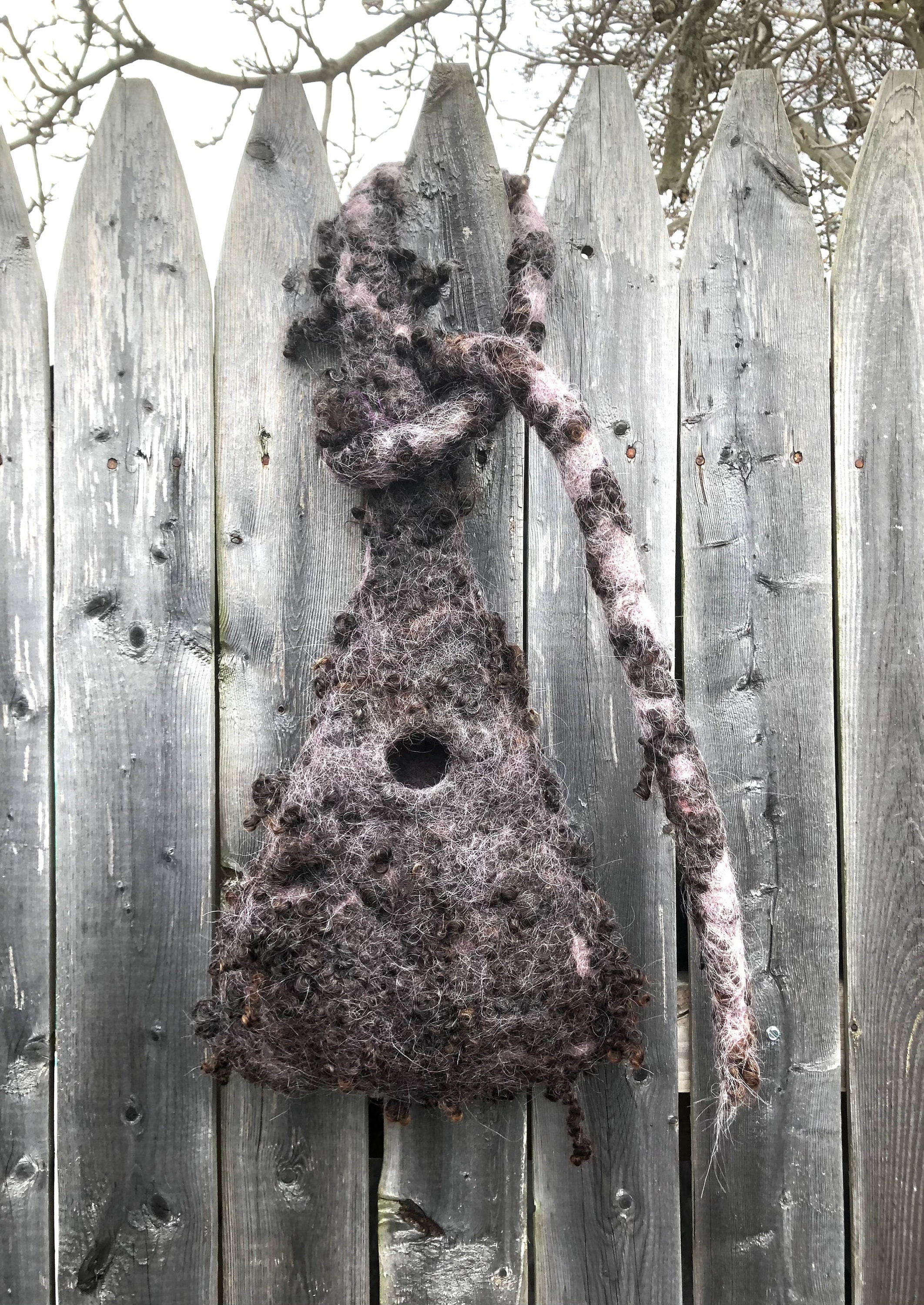 This Nesting Pod has been wet felted by hand with all natural materials using 100% wool and sheep locks. The strap can be looped and tied over a tree branch or hook and the pod itself is light weight yet rain resistant due to the strong quality of wet felted wool.