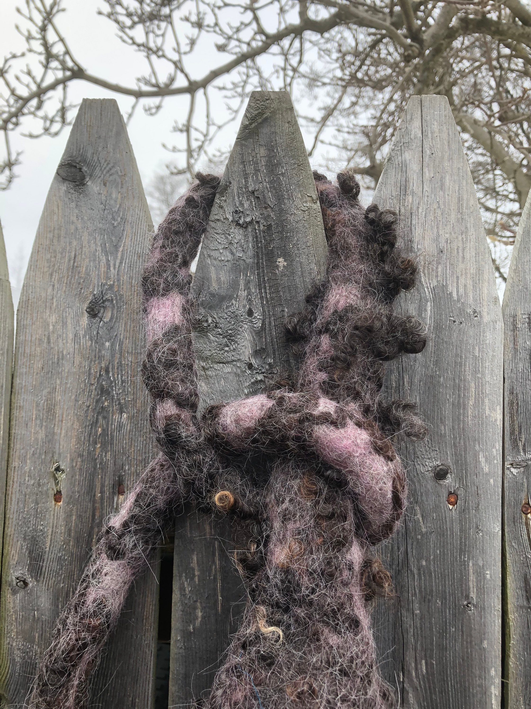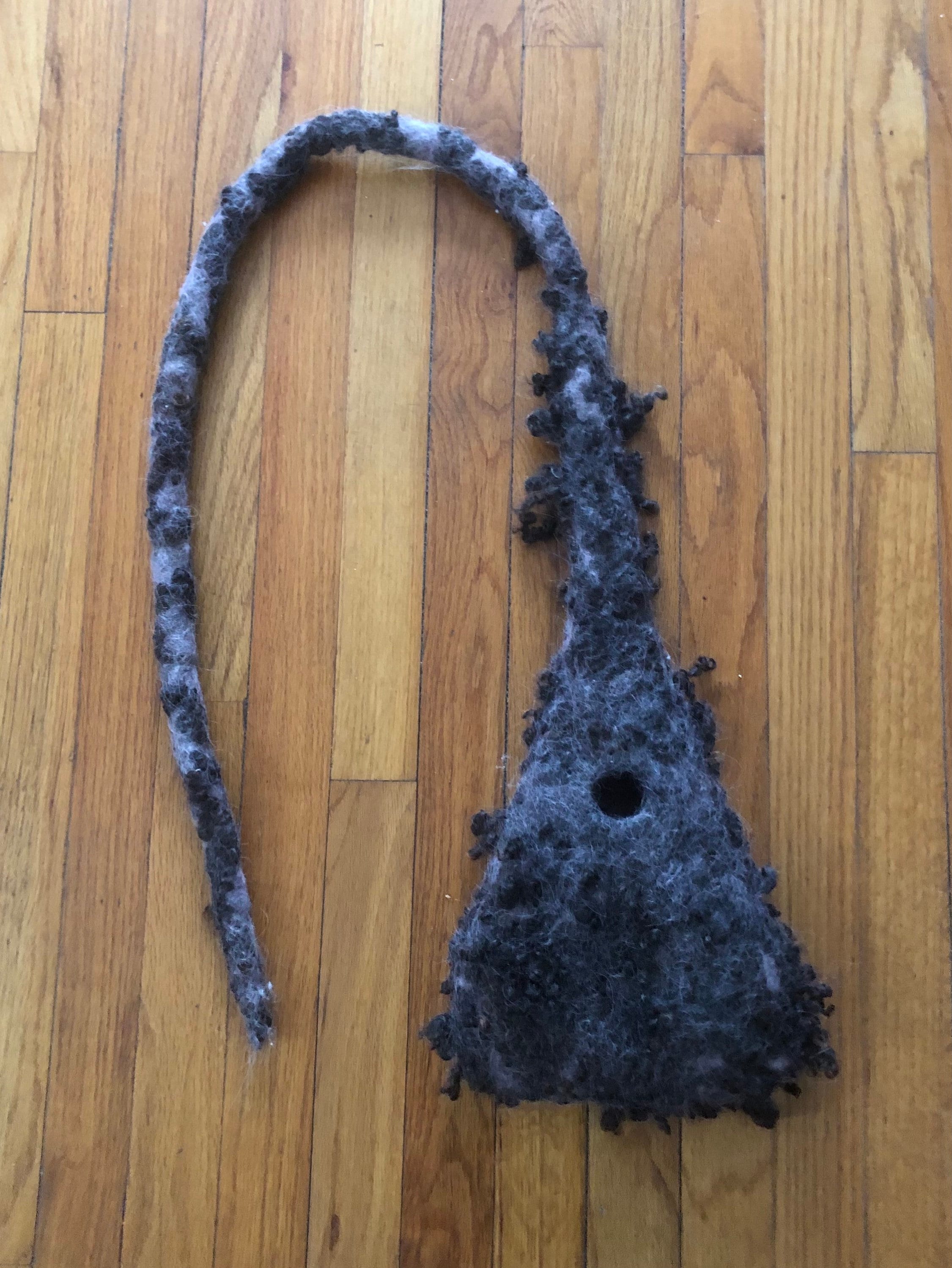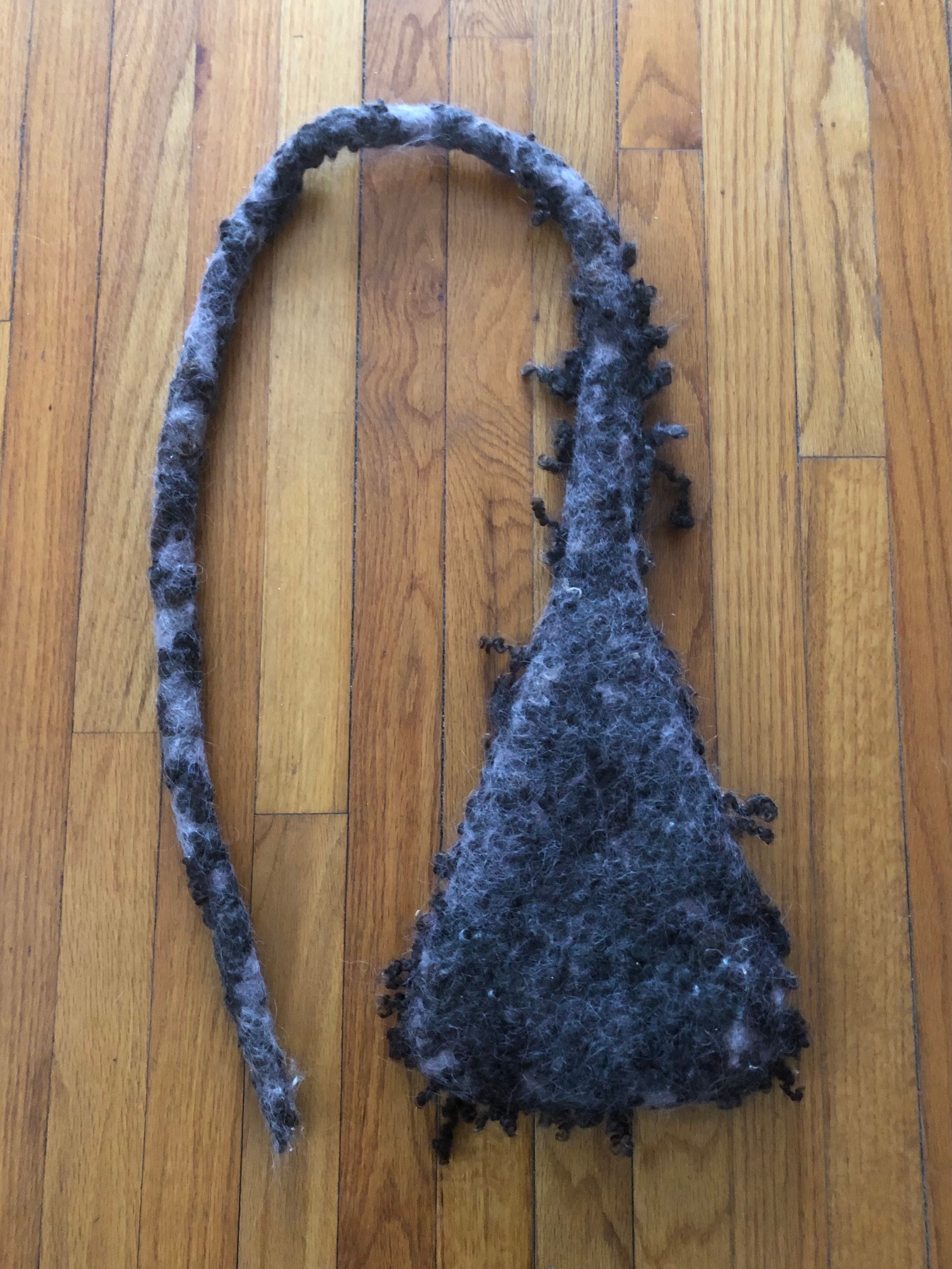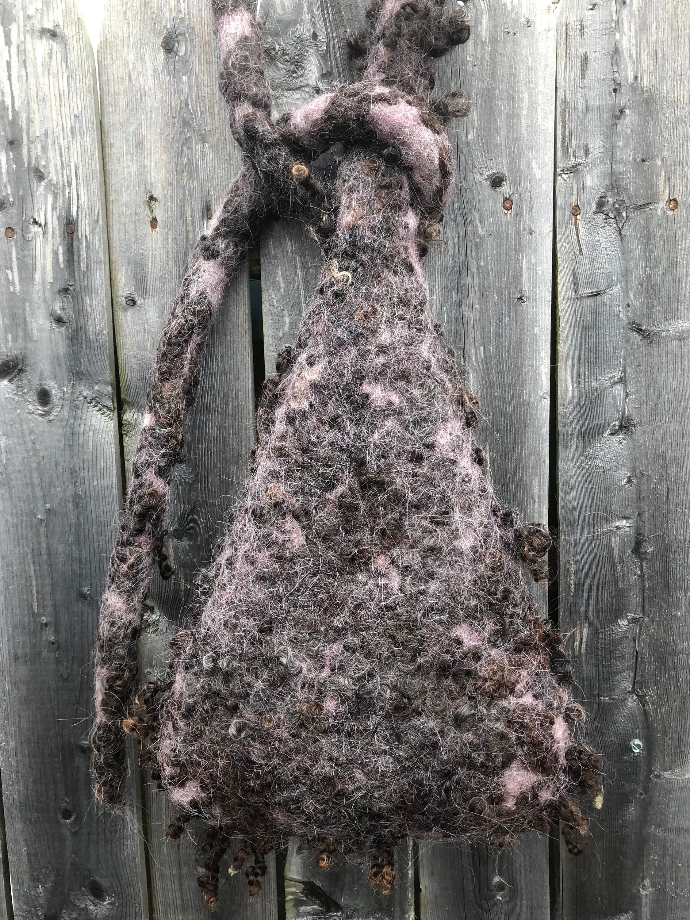 This Nesting Pod has been wet felted by hand with all natural materials using 100% wool and sheep locks. The strap can be looped and tied over a tree branch or hook and the pod itself is light weight yet rain resistant due to the strong quality of wet felted wool.